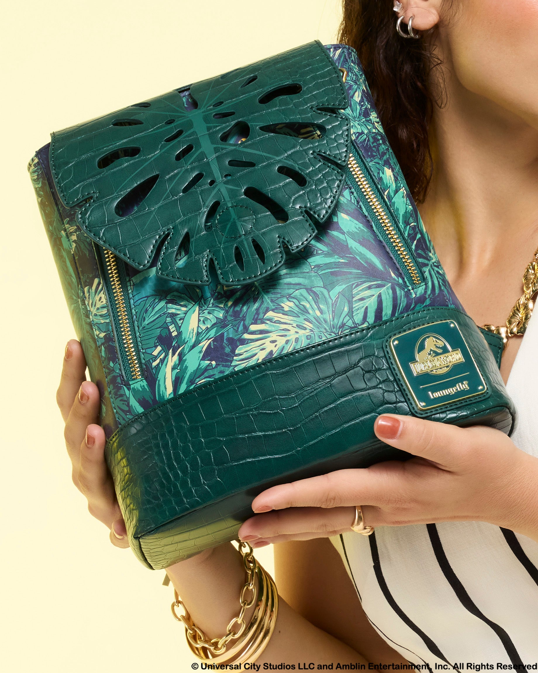 Foliage designs cover this bag and the top flap is in the shape of a leaf. When it's secured in place, you can see the eye of a velociraptor peeking through. Lift the flap to reveal the entire dinosaur! Crocodile faux leather gives it an extra Jurassic-era feel.