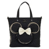 This bag converts between a backpack and a tote bag. All over, you'll find a quilted pattern of Mickey Mouse silhouettes. The front pocket looks like Minnie Mouse's silhouette "sketched" on the bag. It has a 3D bow! You'll find embroidered flowers and leaves along the side.