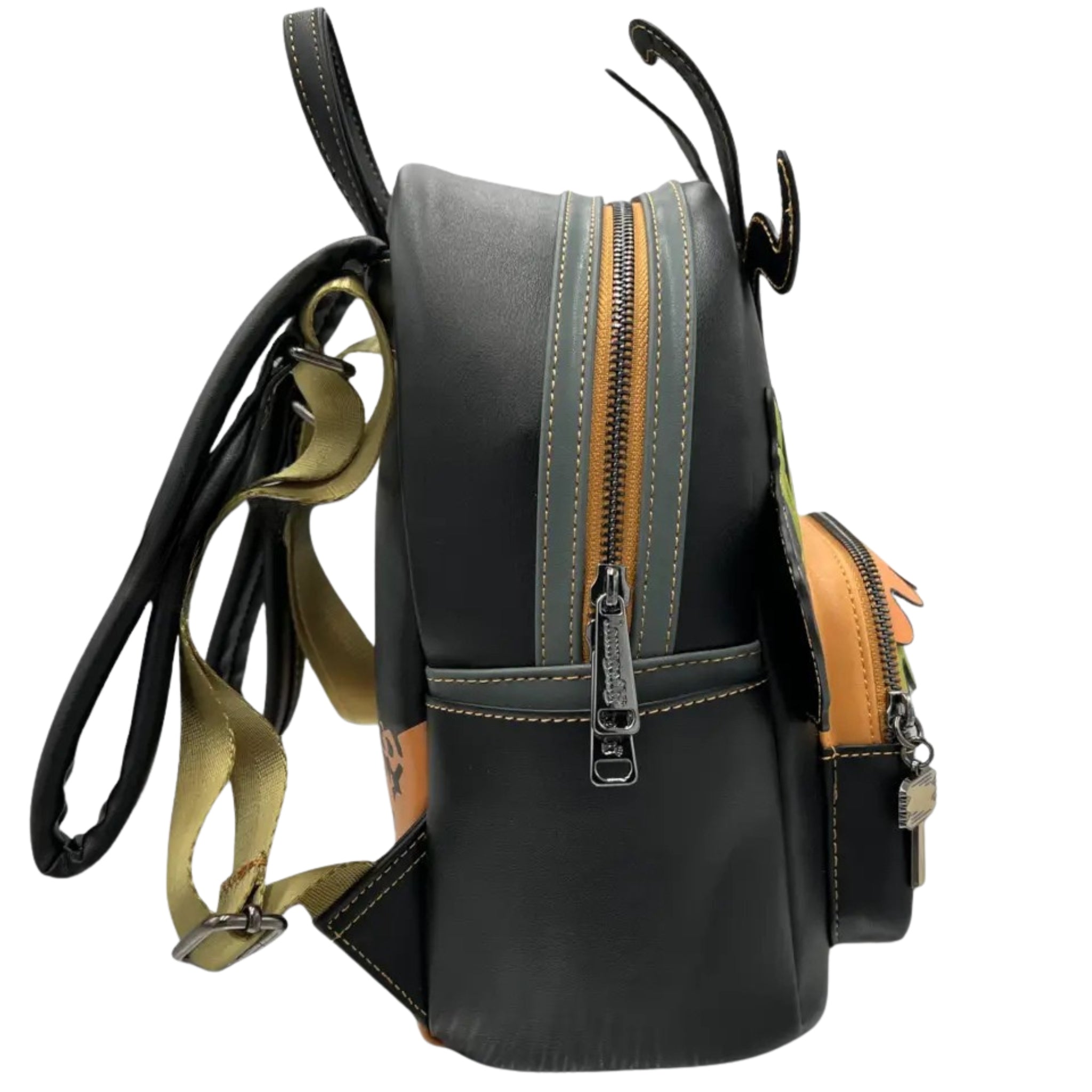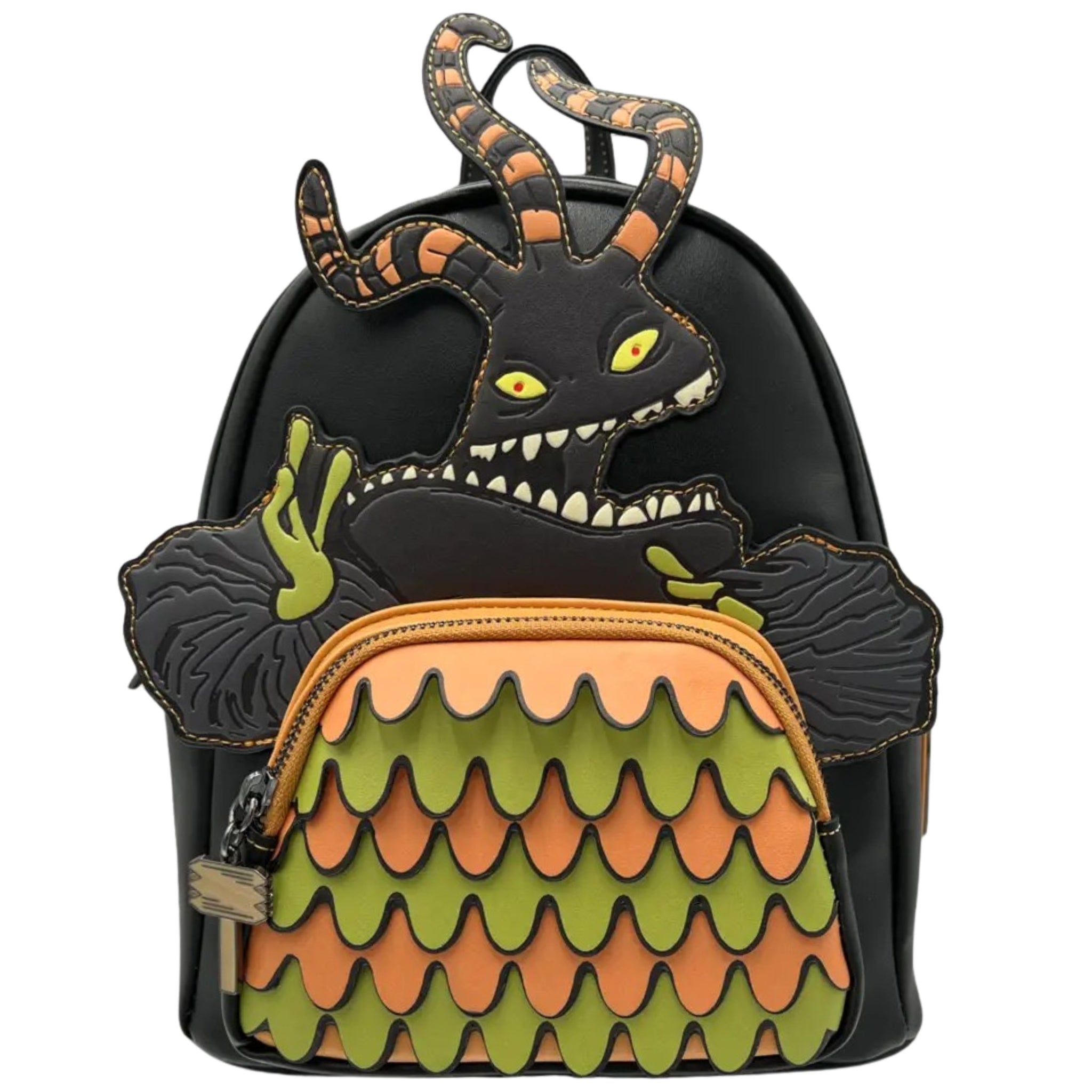 Embrace the spooky season all year round with this frightful backpack. Debossed details abound on the Harlequin Demon's arms, horns and face and his glow-in-the-dark eyes bring this creature to life. The front zip pocket is adorned with layers of wavy orange and green appliques and a charming wooden mallet zipper pull.