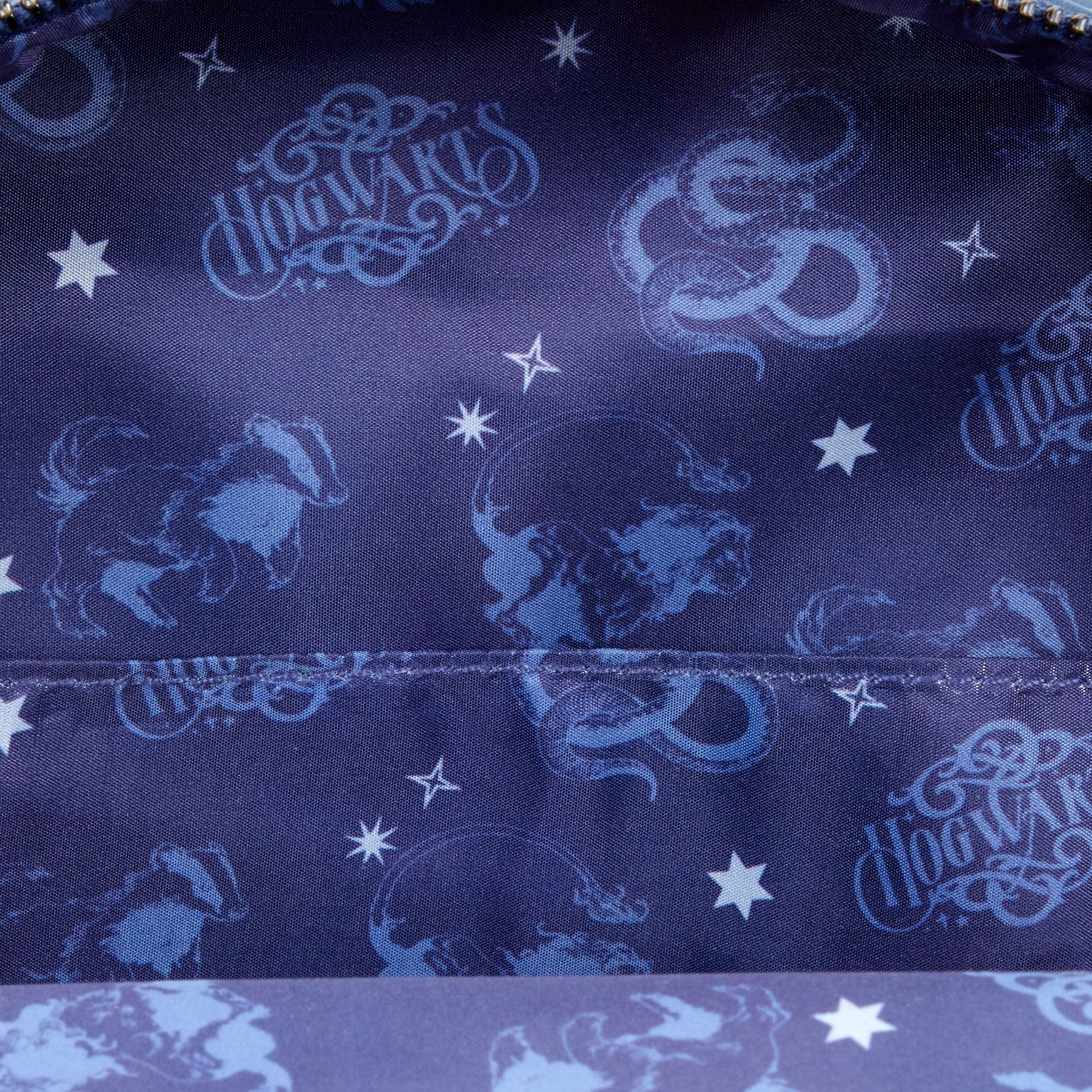 This mini backpack features faux denim, metal charms, and fringe. On the front pocket, you'll find the Hogwarts™ crest with symbols of each house. The bottom of the front pocket and side pockets feature an all-blue argyle-type pattern, which includes the Hogwarts™ "H" symbol. Turn it around to find "Harry Potter" debossed on one of the straps.