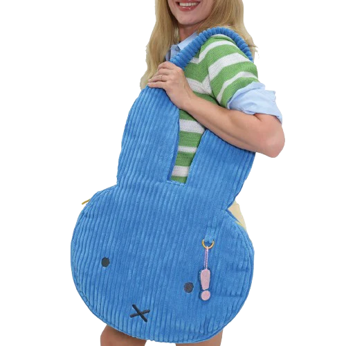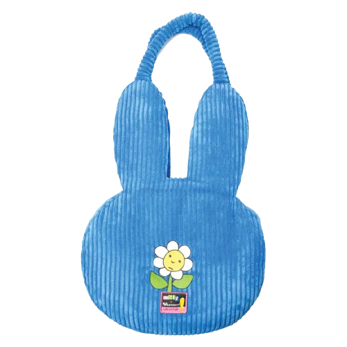 Oversized plush corduroy tote shaped like Miffy’s head. Embroidered face and daisy on back. Includes exclusive layered bag charm.