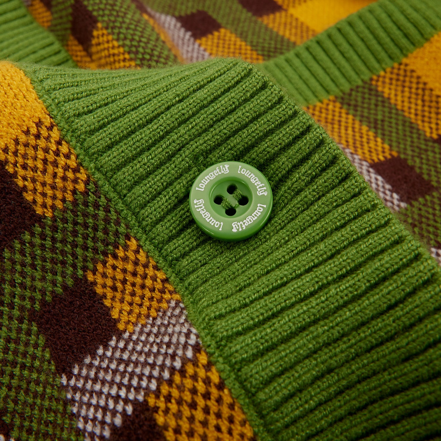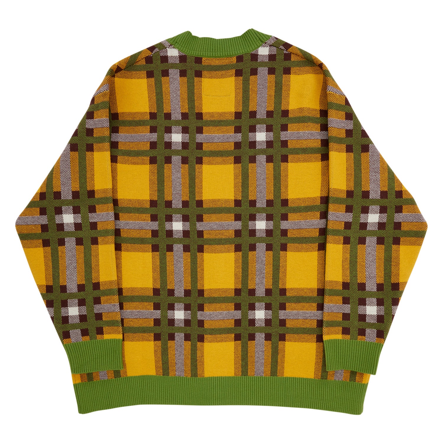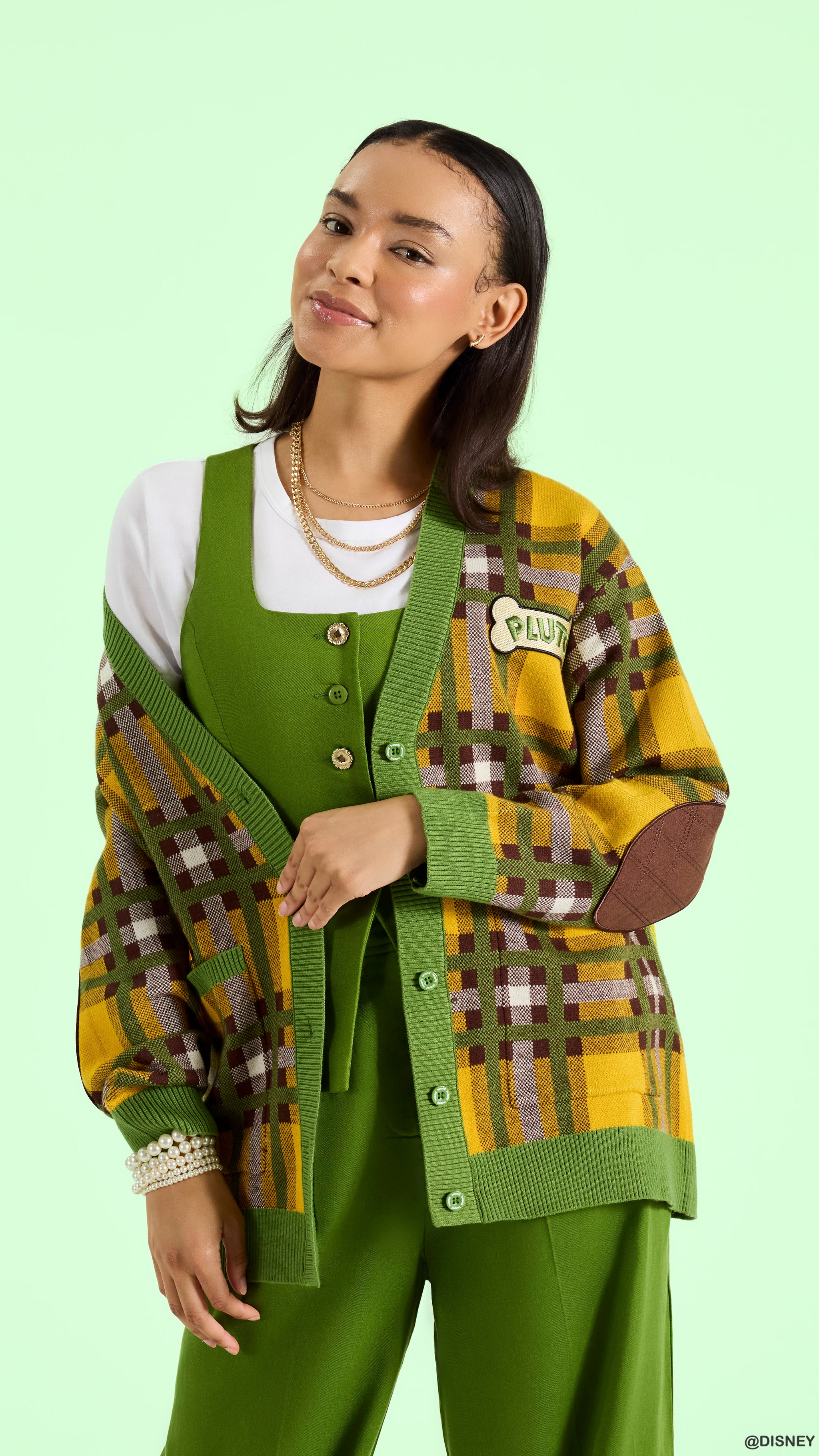 This knit cardigan features yellow-and-green plaid with green accents at the collar, cuffs, pockets, and over the elbows. You'll find "Pluto" written inside a bone in the upper right corner. Pluto also peeks out from one of the pockets!