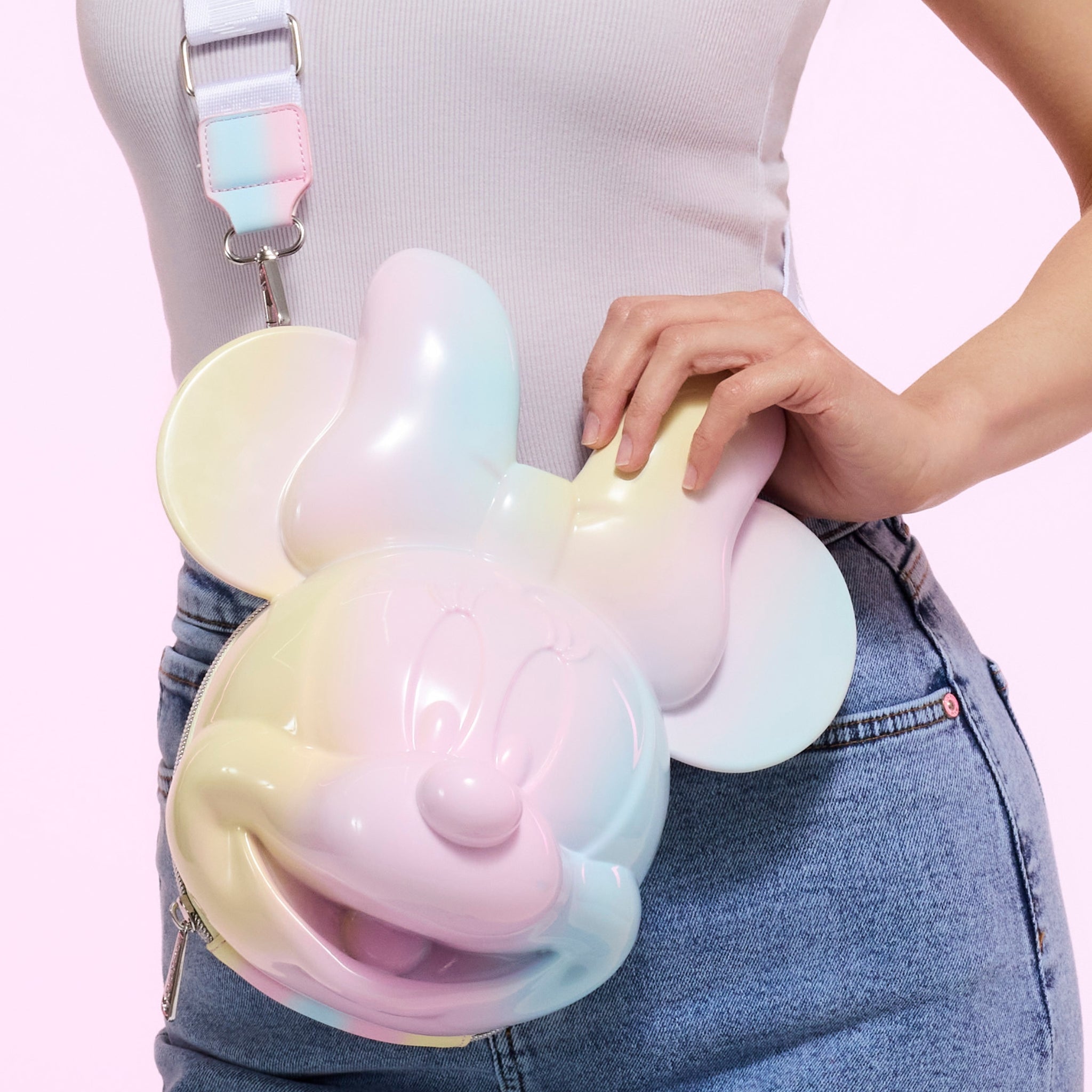 This crossbody bag features a 3D-molded Minnie Mouse head! She grins out from the front of the bag. Minnie is decorated with pastel tie-dye of pink, blue, and yellow. An adjustable crossbody strap says "Minnie" all over it.