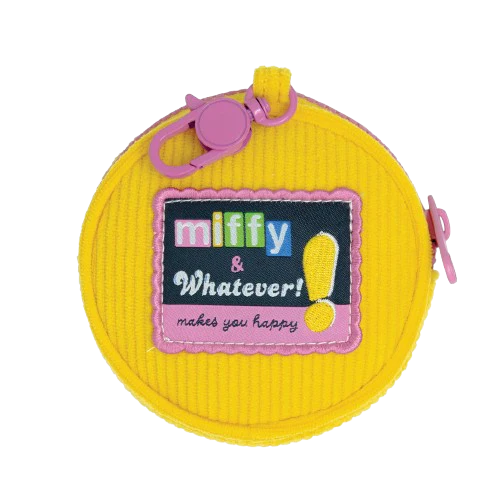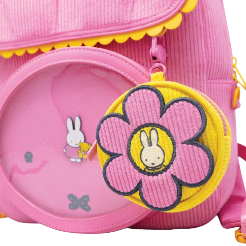 Features: Dual purpose coin bag and bag charm, pink clip for easy attachment to bags or key rings, Miffy-in-bloom design on front; solid yellow corduroy back.