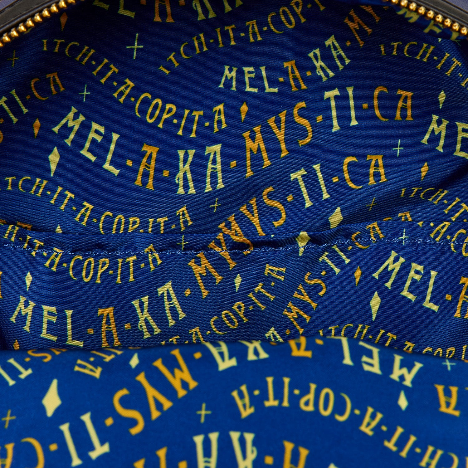 This mini backpack features the Sanderson sisters from Disney's Hocus Pocus. They dance together under a starry sky in a graveyard. Binx pops up from behind a headstone! On the side pockets, you'll find gold foil details of each of their brooms.