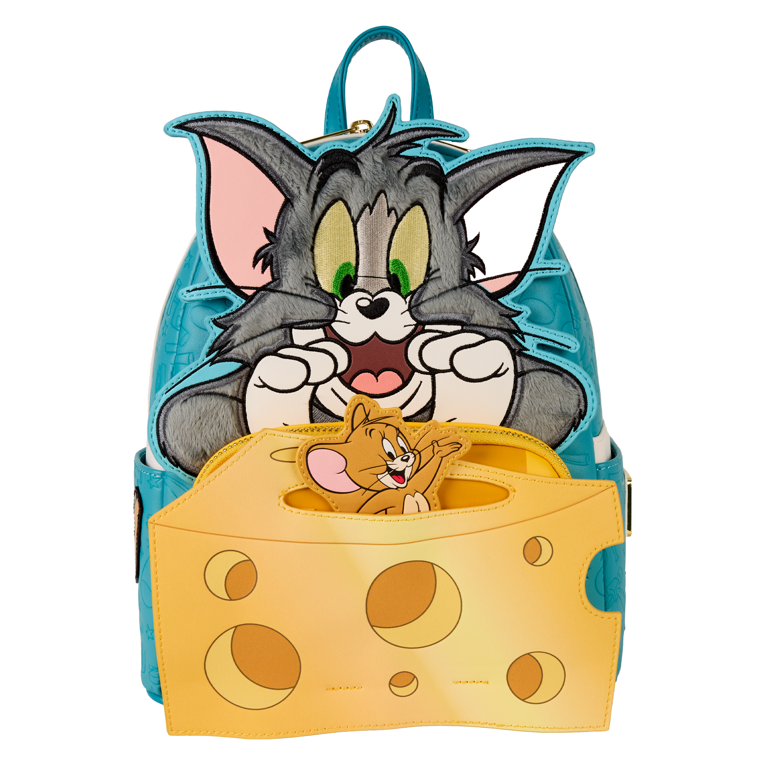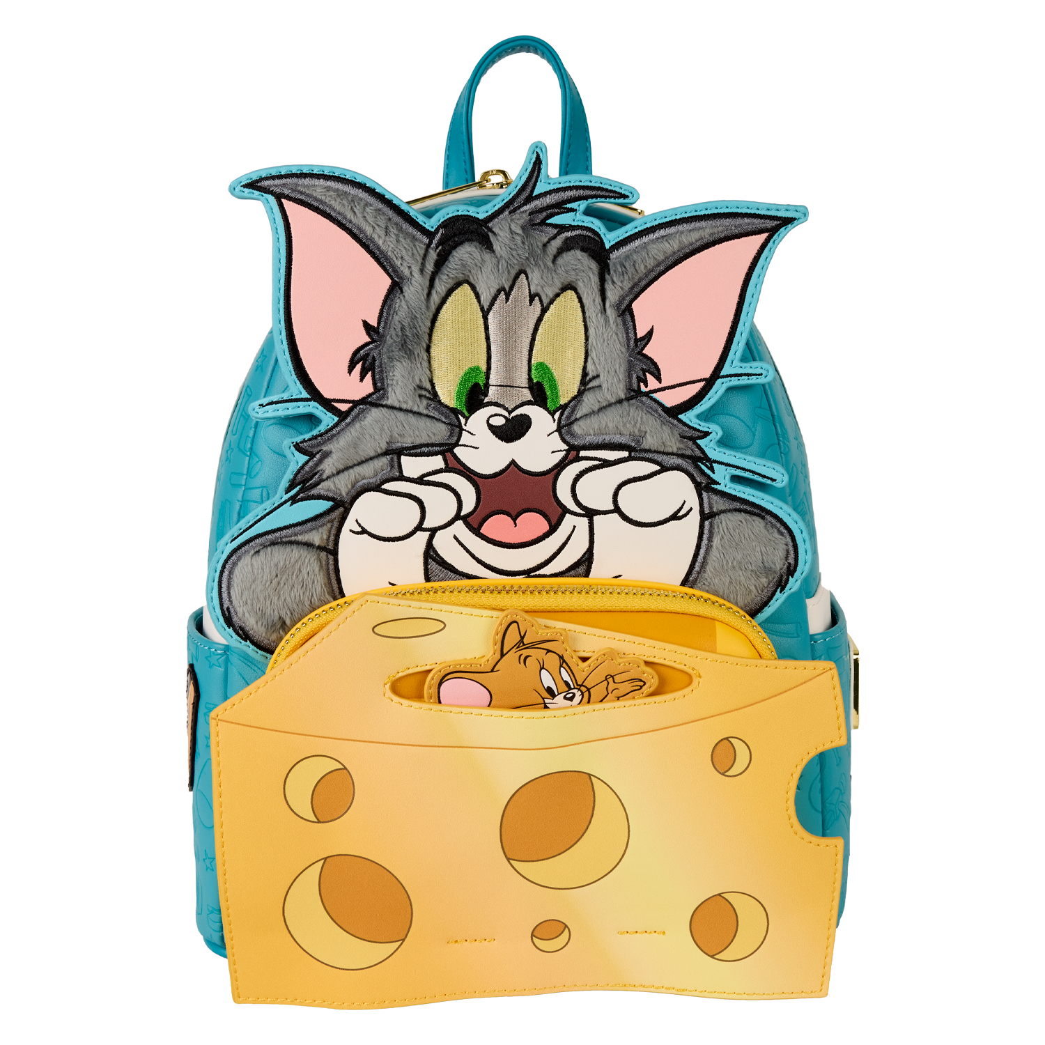 On the front, you'll find Tom in plush detail looking excitedly at a wedge of cheese, which Jerry pops out of! On the side pockets and the straps, you'll find various tools Tom uses to try and catch Jerry, like a mouse trap, a baseball bat, and a mallet. You'll find debossed motifs of the show all over the bag.