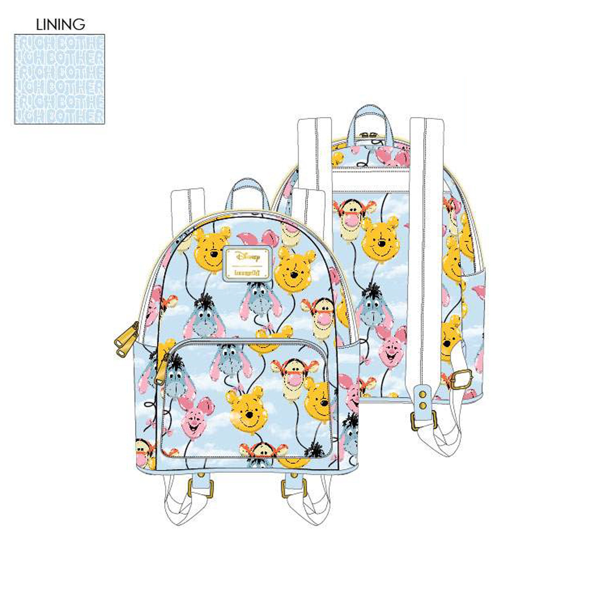 Winnie the Pooh and friends join you on new adventures as a Loungefly Winnie the Pooh Balloon Friends Mini Backpack. Piglet, Tigger, Eeyore, and Pooh Bear are depicted as balloons flying high into a blue sky.