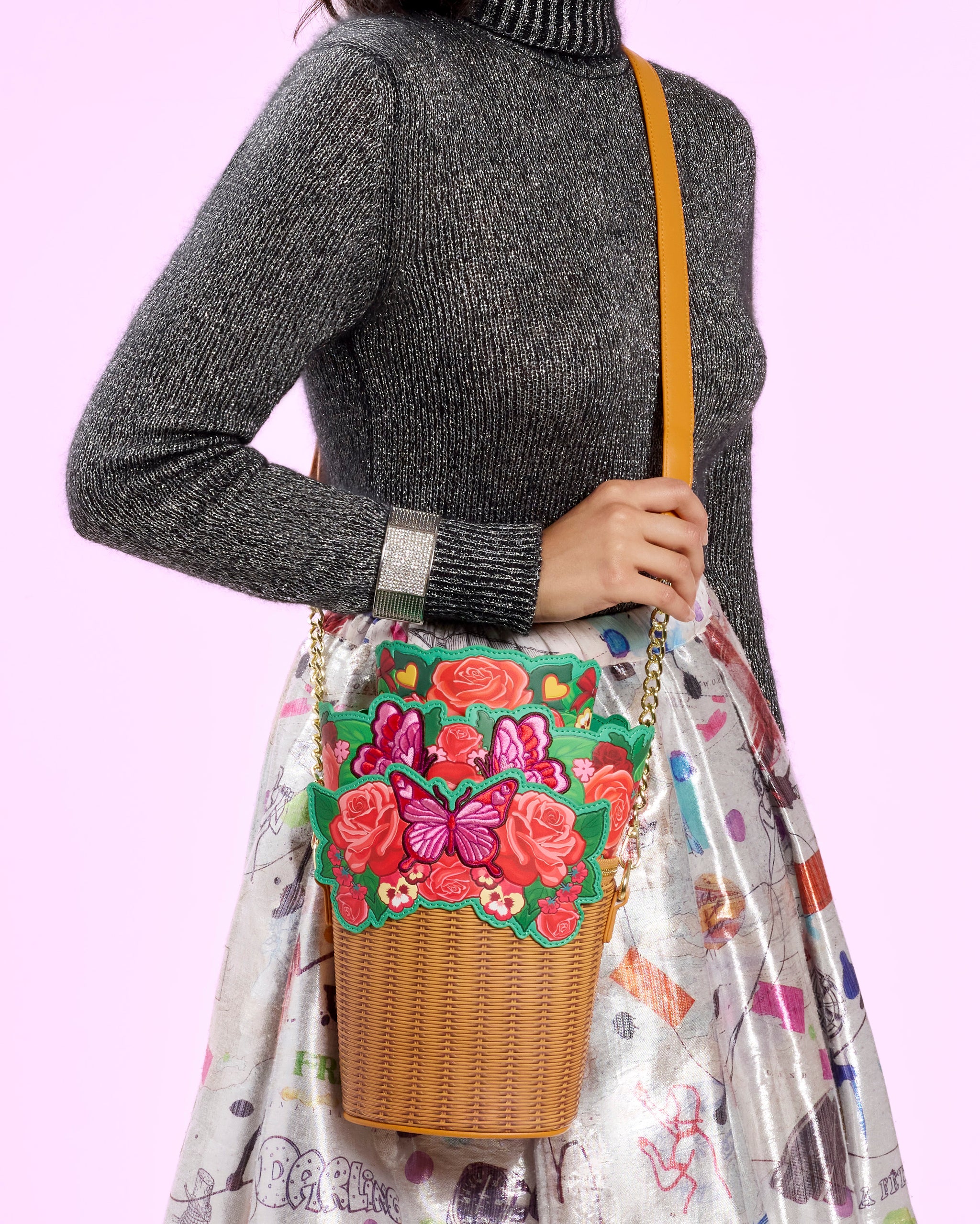 This figural crossbody bag looks like a basket of flowers! You'll find embossed details to give texture to the body of the bag. At the top, you'll find applique flowers and butterflies with embroidered details. This is a perfect way to embody the sweetest season!