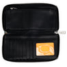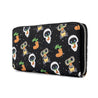 Features: Wallet zips closed, has sturdy metal hardware, and features printed details.