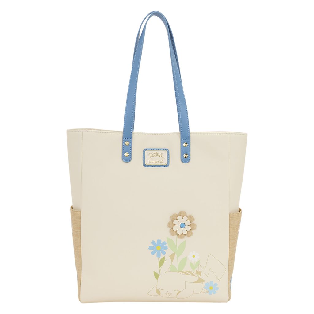 This tote features the outlines of some of your favorite Pokémon: Pikachu, Bulbasaur, and Eevee surrounded by flowers. You'll find woven details on the sides along with flowers. Attached to the bag is a detachable coin bag in the shape of a Poké Ball! Turn the bag around to find an adorable image of Pikachu sleeping amongst the flowers!