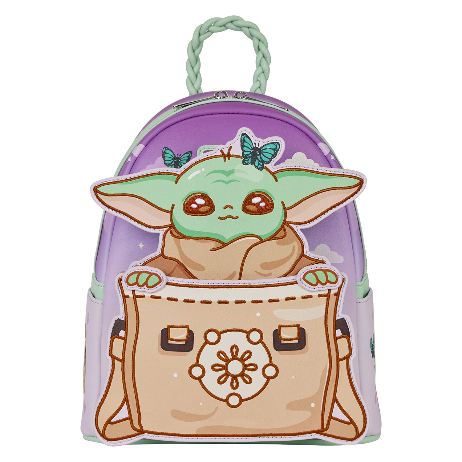 This adorable mini backpack features a hidden pocket behind an applique in the shape of a bag. Grogu pops up from the bag! Behind him is a purple sky with butterflies and clouds. Butterflies are also present on the straps. Find more super cute illustrations of Grogu on the side pockets.