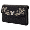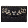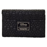 This wallet features a quilted pattern all over of Mickey Mouse silhouettes. The top flap features a metal charm of a Mickey Mouse silhouette flanked by embroidered details of flowers and leaves. Inside, there are seven card slots and one clear slot for an ID.