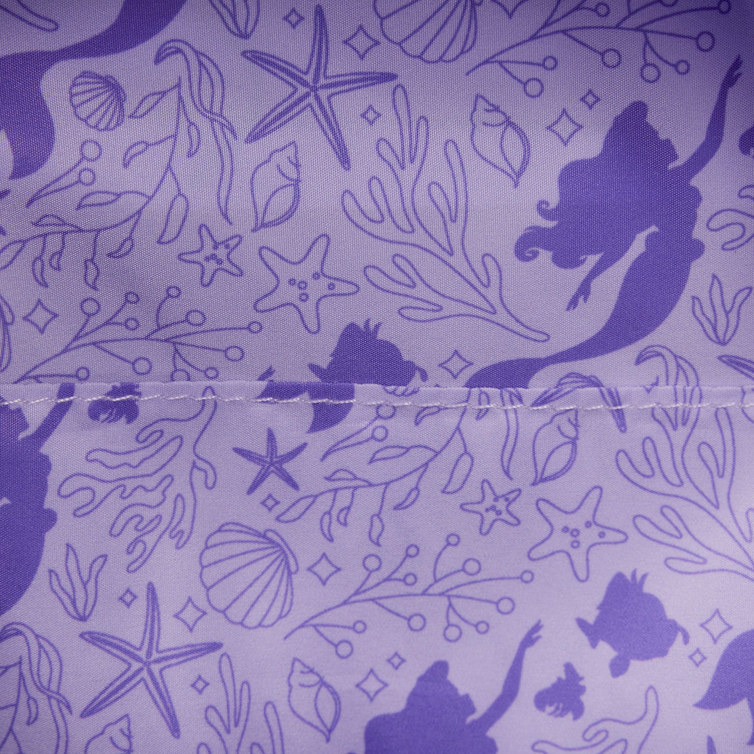 This mini backpack is inspired by Ariel from Disney's The Little Mermaid. You'll find purple-to-green iridescent material featuring fish scale details. Faux pearls appear on the front and side pockets. A 3D bow can be found at the top of the bag, featuring an enamel charm of a seashell with tulle and faux pearls. Check out the straps to find an applique of a purple seashell!