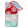 This card holder features three Hershey's Kisses stacked on top of each other, one is red, one is silver, and one is green. Each has silver foil snowflakes on its wrapper. Silver metallic faux leather covers the rest of the card holder. Turn it around to find four card slots!